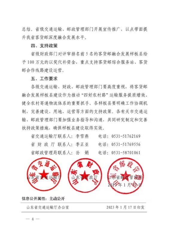根据《山东省人民政府关于印发 2023 “稳中向好、进中提”政策清单(第一批)的通知》(鲁政发〔2022〕18 ),2023年省交通运输厅、省财政厅、省邮政管理局联合开展第三批农村客货邮融合发展样板县建设,现将有关事项通知如下:
