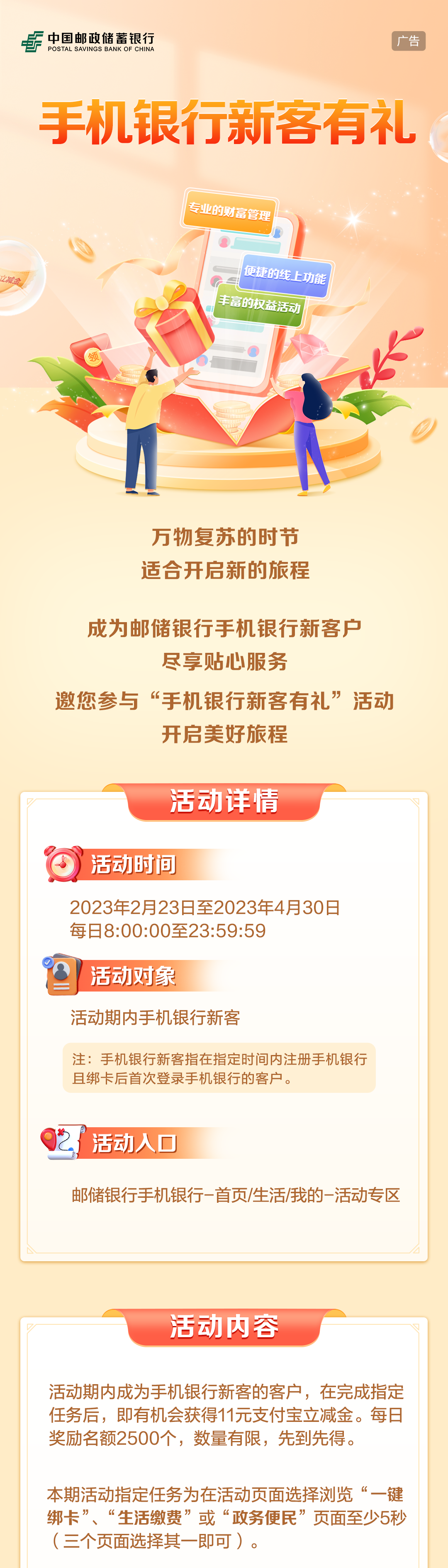 4.活动入口:邮储银行手机银行-生活-活动专区-邮储银行手机银行-我的-活动专区(请您将邮储银行手机银行APP更新至8.0及以上版本)