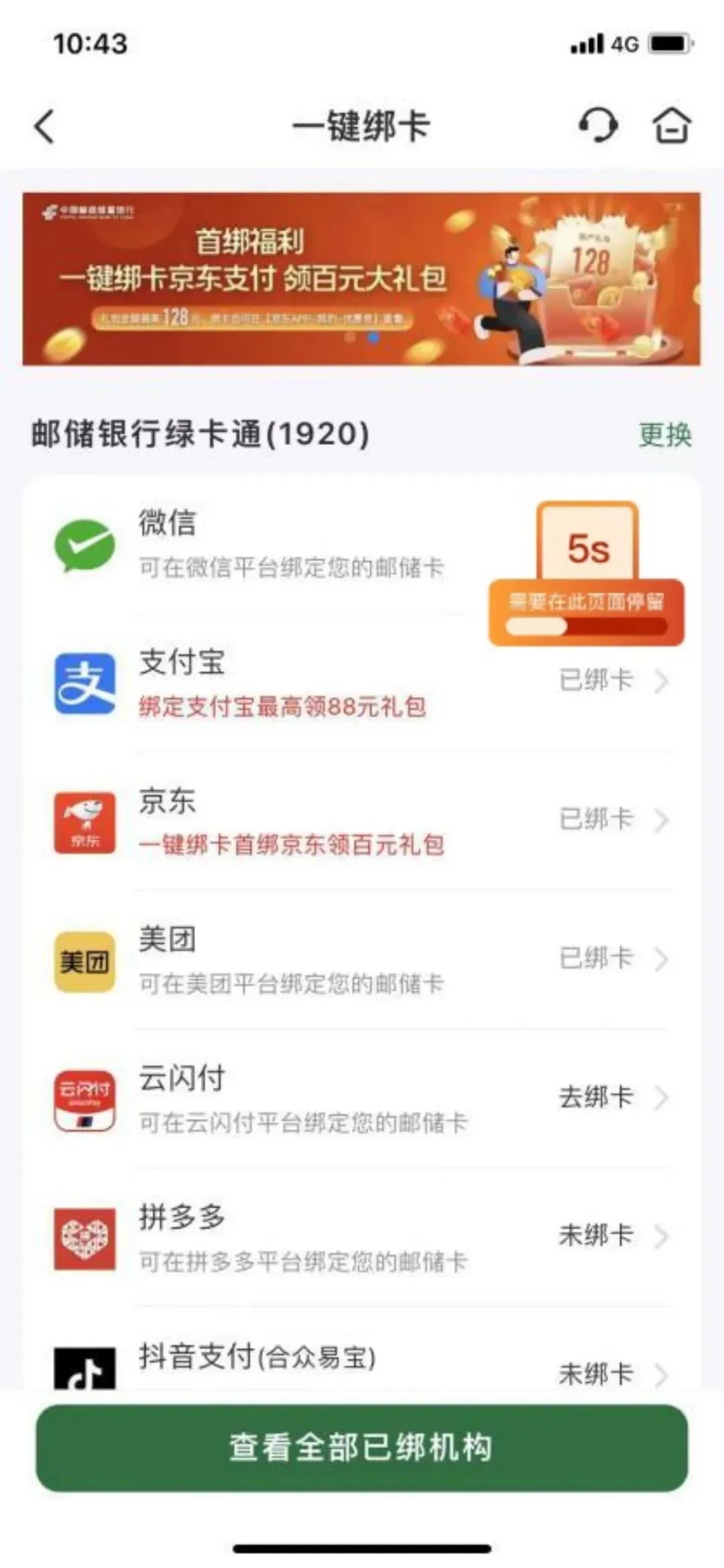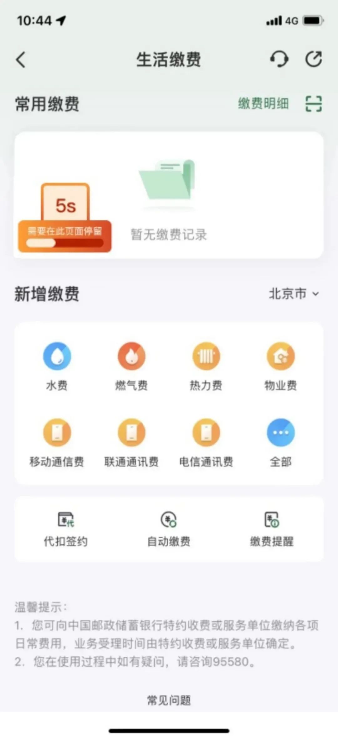 6.本期活动指定任务为在活动页面选择浏览“一键绑卡”、“生活缴费”或“政务便民”页面至少5秒(三个页面选择其一即可)。必须从活动页面跳转指定页面且浏览时间达到规定时间才能视为完成任务,如从其他入口进入功能页面,或浏览时间不足规定时间,均视为未完成任务。