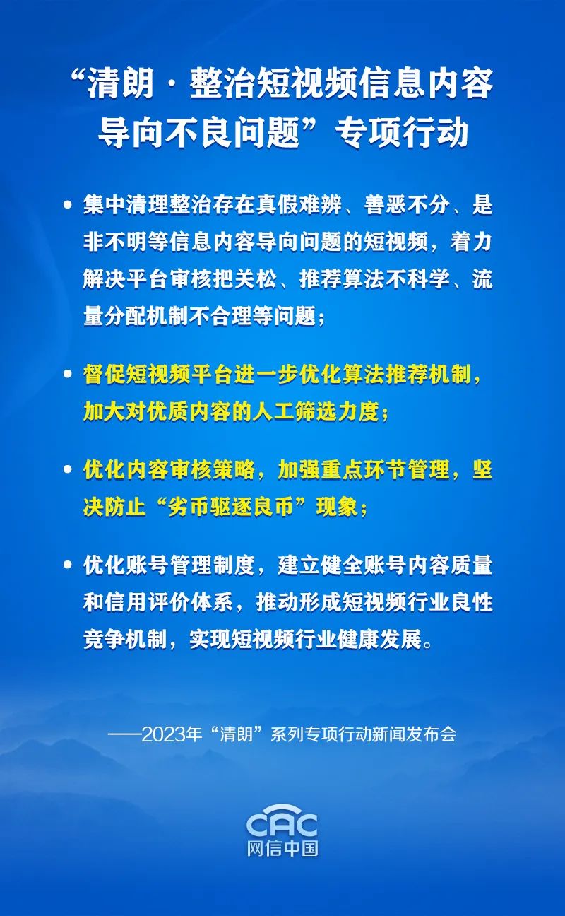 在集中整治基础上,我们将以效果为导向,督促短视频平台力争做到三个优化,一是优化算法推荐机制,加大对优质内容人工筛选力度,并赋予较高的推荐权重,将用户找内容的逻辑升级为优质内容找用户。二是优化审核策略,建立健全社会效益第一、社会效益与经济效益并重的创作激励机制,加强重点环节管理,坚决防止首页首屏、热搜热榜成为导向不良信息的放大器,坚决防止“劣币驱逐良币”现象。三是优化账号管理。建立健全账号内容质量和信用评价体系,建立账号黑名单和MCN机构分级处罚机制,强化账号全流程、全过程管理。希望通过专项整治能够重新塑造短视频领域的良好生态,推动短视频行业的健康发展。谢谢。