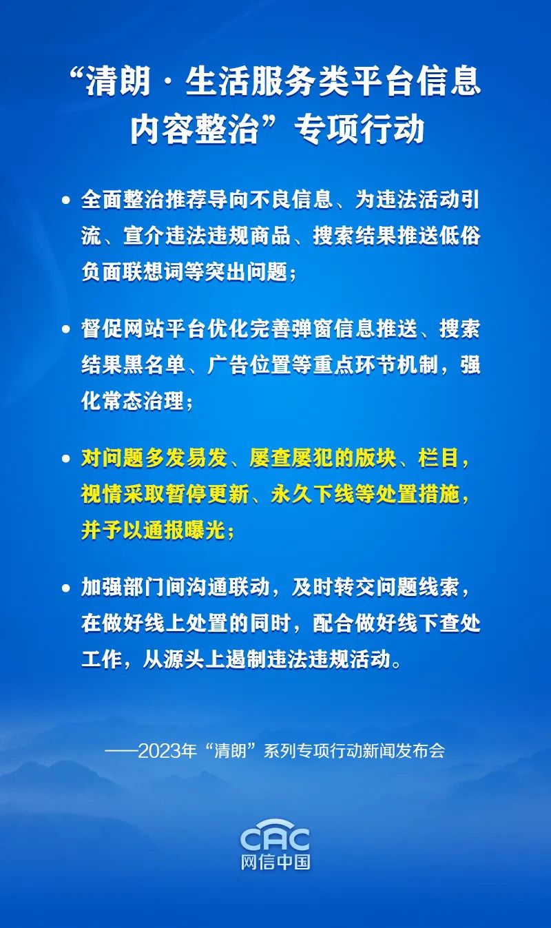 “三个重点”。一是找准切入点,突出重点环节整治。督促各网站平台严格规范资讯环节信息推送管理,防止推送导向不良信息,严禁为违法活动引流,加强电商平台商品宣介、直播、评论、问答环节管理,打击违法违规营销行为;严管搜索引擎平台的搜索结果、联想词、相关推荐,确保网络生态良好。二是明确着力点,突出治理机制建设。督促网站平台规范搜索抓取范围,健全搜索结果黑名单机制,防止推荐违法和不良内容;优化完善广告位置和弹窗信息推送管理机制,避免干扰权威信息呈现;对问题多发易发、屡查屡犯的版块、栏目,视情采取暂停更新、永久下线等处置措施,并予以通报曝光。三是把握关键点,突出线上线下联动。生活服务类平台信息内容乱象涉及的领域比较多,需要强化统筹、协同治理。我们将加强部门间的沟通联动,及时转交问题线索,在做好线上处置的同时,配合做好线下查处工作,从源头上遏制违法违规活动。