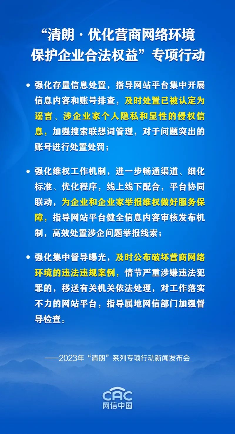 这次专项行动我们会突出两个重点:一是着力维护企业和企业家的网络合法权益;二是着力治理编造传播虚假不实信息的网络乱象。