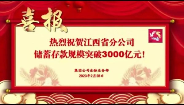 截至2月28日,我省邮政储蓄余额规模突破3000亿元,达3000.23亿元,规模排名前移1位,列全国第12位。其中,2022-2023年金融跨年度营销活动期间余额净增超400亿元;本年度新增存款285.84亿元,较上年底存款规模增长10.53%,增幅列全国第1位。