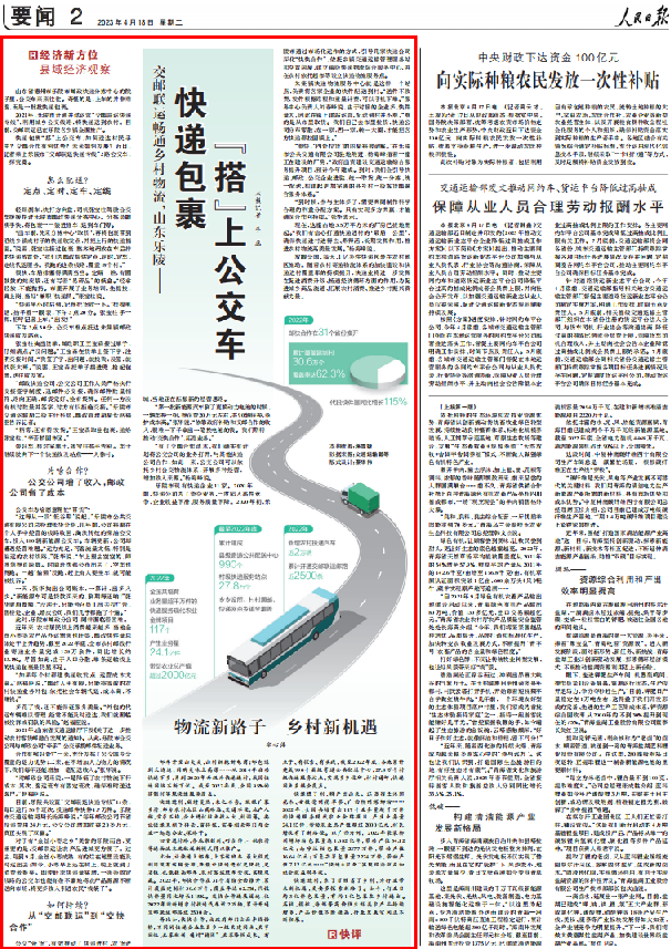 4月18日出版的《人民日报》刊发了《交邮联运畅通乡村物流,山东乐陵——快递包裹“搭”上公交车》文章,报道了山东邮政多部门联合推进农村交邮联运、客货邮发展等工作成效,有效推动了快递进村、农货进城,畅通了乡村物流,拓展了农村消费,助力了乡村振兴、经济循环。全文如下: