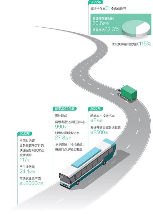 比如,让快递上邮车、上客运班车,最大程度利用现有运输资源,既能让快递进村更便捷、更省钱,也能提高邮车、农村客运班车营收,实现双赢。2022 年,邮快合作在31个省份全面推开,累计覆盖建制村30.6万个,覆盖率达62.3%,代投快件量同比增长115%。交快合作进展迅速,仅2022年就新增农村投递汽车近 2万辆,累计开通交邮联运邮路近2500条。
