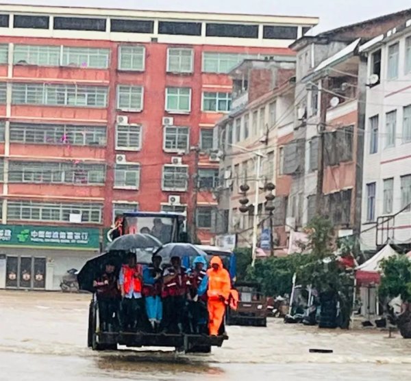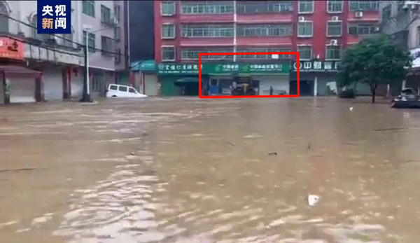 梨溪镇距离县城21公里,平时只需要半小时的车程。该镇地势也并不低洼,谁也没想到这里会发生这么大的洪水。因为雨势太大,抢险小分队历时一个小时才到达,此时梨溪邮政所所在的街道积水已经超过2米,大家不敢贸然前行,只能驻足等待。