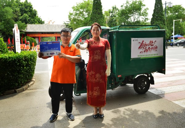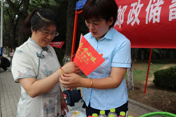 淄博邮政服务人员为高考学子家长送水,送端午节粽子香包,送“金榜题名”手绳。粽子香包高举过头,寓意一举高中(粽)!