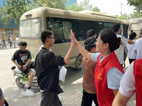 “加油!加油!你是最棒的!”聊城莘县邮政的高考服务志愿者与莘县实验高中考点的考生们开心击掌、鼓劲。