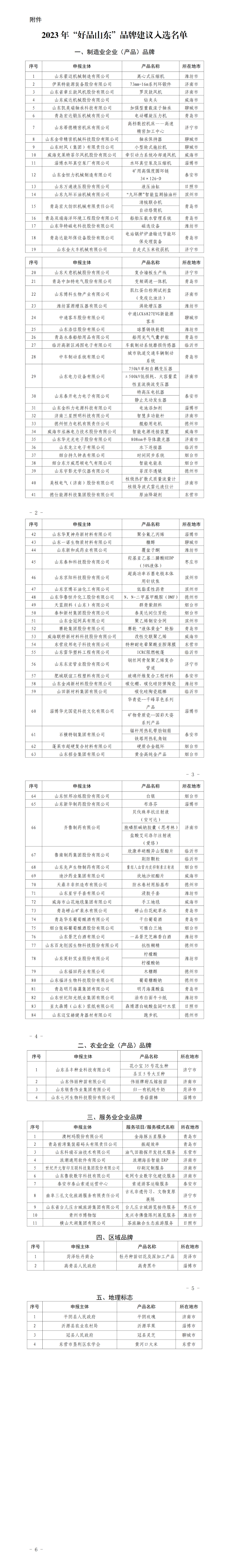 根据《山东省人民政府关于共建共享“好品山东”推动高质量发展若干措施的通知》(鲁政字〔2021〕25号)要求,山东省质量强省及品牌战略推进工作领导小组办公室(简称质量强省办)牵头组织开展了2023年“好品山东”品牌遴选工作。经组织申报、部门推荐、资格审查、系统赋分、专家评审、综合评价等程序,择优遴选产生了2023年“好品山东”品牌建议入选名单,经山东省质量强省及品牌战略推进工作领导小组会议审议通过,现予以公示,广泛听取意见,接受社会监督。