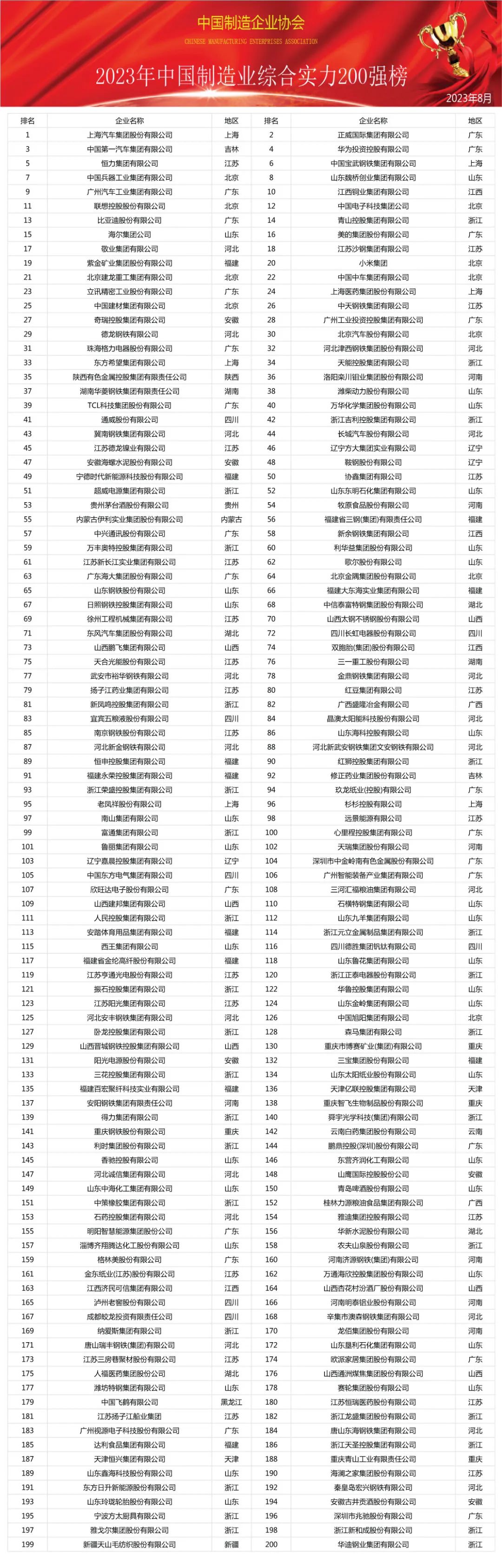 据悉,排行榜是中国制造企业协会对我国制造业企业进行全面、科学、独立的企业实力发展调查研究宣传发布工作。通过对超过8000家利润总额在5000万元至500亿元之间的中国大陆制造型企业进行了数据采集研究,基于对财务分析、行业分析、市场占有率分析确定候选企业,邀请100位企业高管、学者及官员对经资格审核符合要求的企业进行评选,比照国际上通行的做法,根据营业收入、资产总额、利润总额、所有者权益、研发投入、从业人数等指标对候选企业进行综合评分排出,并对部分候选企业进行实地拜访,从中遴选出200家《中国制造业综合实力200强》企业及100家《中国装备制造业100强》企业。