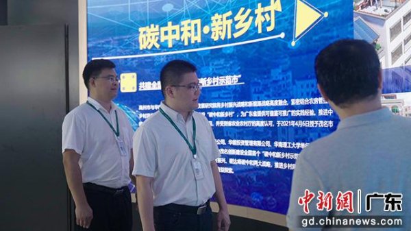 华能(茂名)清洁能源有限公司工作人员向邮储银行客户经理王银治与吴志强介绍新乡村实践经验