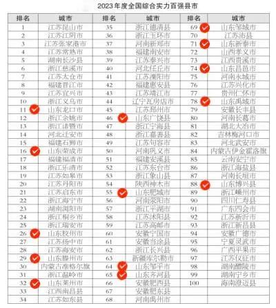 2023年度全国综合实力百强县市榜单中,山东共有14地入选:龙口市、荣成市、胶州市、滕州市、莱州市、广饶县、肥城市、邹平市、齐河县、邹城市、新泰市、昌邑市、禹城市、博兴县。