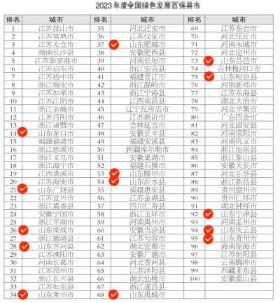 2023年度全国绿色发展百强县市榜单中,山东共有14地入选:龙口市、广饶县、荣成市、齐河县、莱州市、肥城市、滕州市、沂水县、禹城市、昌邑市、桓台县、宁津县、庆云县、青州市。