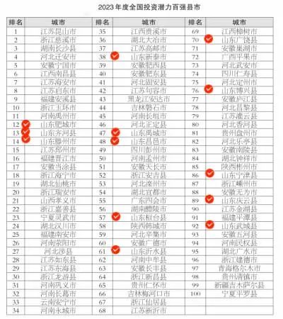 2023年度全国投资潜力百强县市榜单中,山东共有13地入选:肥城市、齐河县、滕州市、新泰市、禹城市、昌邑市、桓台县、沂水县、广饶县、博兴县、宁津县、庆云县、武城县。