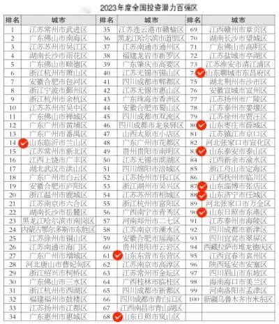 2023年度全国投资潜力百强区榜单中,山东共有9地入选:临沂市兰山区、东营市东营区、日照市岚山区、聊城市东昌府区、枣庄市薛城区、泰安市泰山区、淄博市张店区、济宁市任城区、日照市东港区。