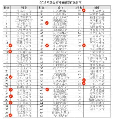 2023年度全国科技创新百强县市榜单中,山东共有14地入选:龙口市、齐河县、广饶县、滕州市、荣成市、新泰市、青州市、莱州市、肥城市、昌邑市、禹城市、博兴县、桓台县、宁津县。