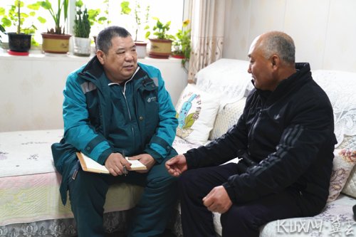 郭红岗(左一)利用送快递的间隙到村民家走访调研,完善两会建议。长城网·冀云客户端记者 刘俐验 摄