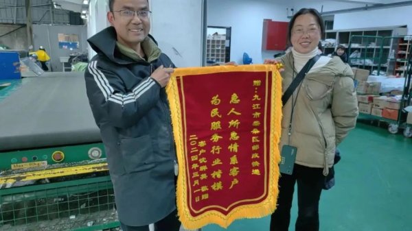 3月5日上午9点,柴桑区分公司寄递事业部邮件处理中心迎来了一位特别的客人——沈女士。她手中捧着一面鲜艳的锦旗,上面用烫金大字写着:“急人所急情系客户 为民服务行业楷模”, 以此表达对处理中心快递员李超的感激。