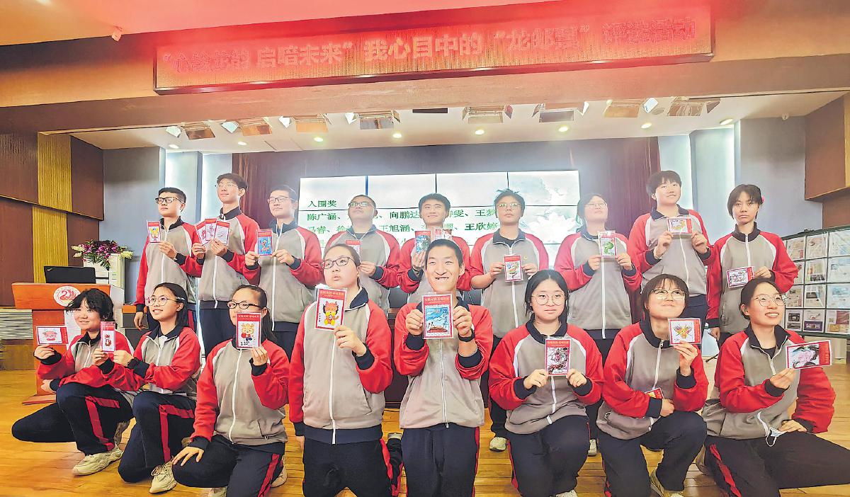 在点评优秀奖作品时,董琪说:“这两幅获奖的邮票设计图具备比较齐全的邮票元素,符合邮票设计的规范。高妍同学的作品体现了对传统文化层面的龙的生动理解,曾繁妤同学的作品将祝福祖国发展的心愿融入其中,都非常不错!”