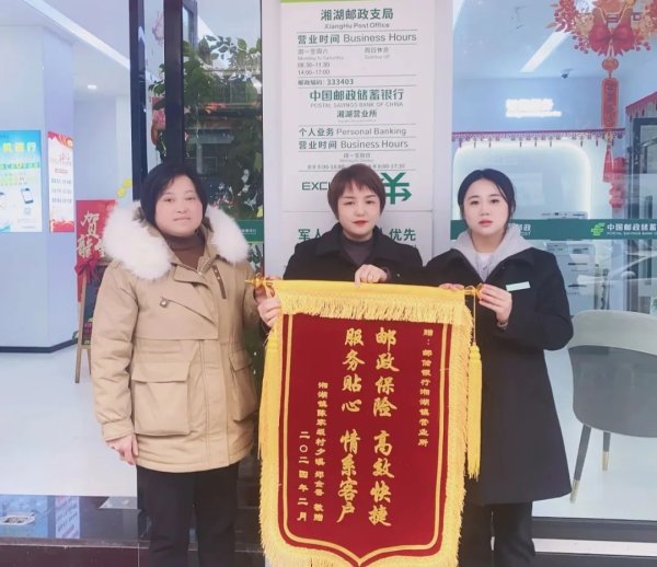“感谢邮政迅速、方便、真诚的服务”。近日,郑女士来到浮梁县分公司湘湖镇营业所,赠送上“邮政保险 高效快捷 服务贴心 情系客户”的锦旗,对湘湖所代理保险的理赔服务连声感谢,点赞邮政员工?心“护航”的服务。