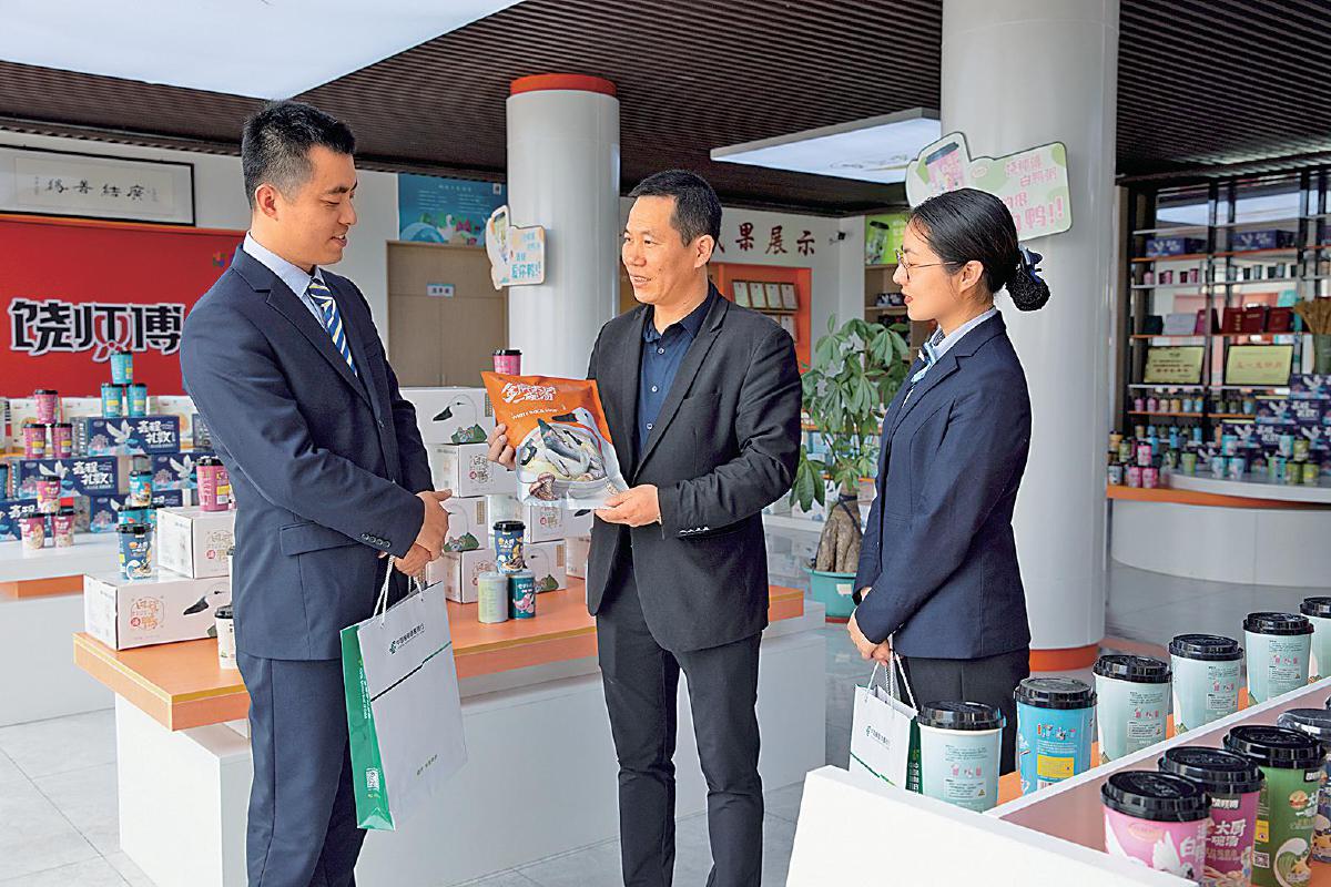 饶鑫程向邮储信贷员介绍白鸭“金牌大厨一碗汤”产品。