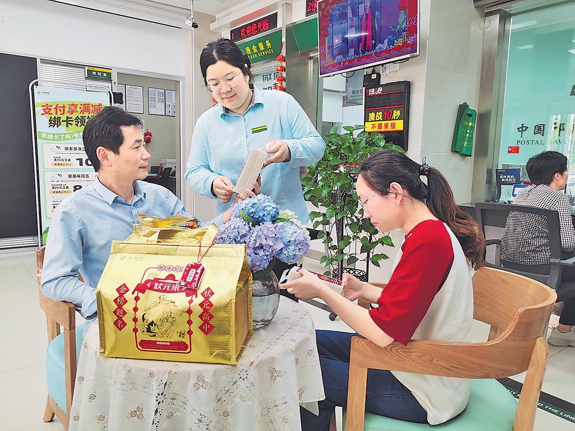 邮政工作人员在网点向客户推介“状元米”祈福礼盒。□陈锐 摄