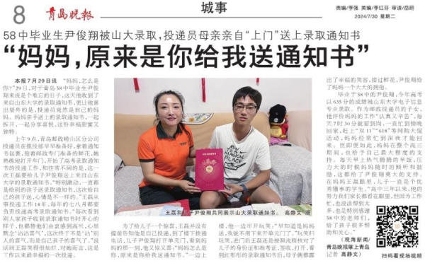 毕业于58中的尹俊翔,今年高考以635分的成绩被山东大学电子信息专业录取。作为邮政投递员的子女,他评价妈妈的工作“认真又辛苦”,每天7时30分就要到岗,一直忙到傍晚回家,赶上“双11”“618”等网购大促活动,妈妈经常忙到深夜才能回来。但即便如此,妈妈在整个高三期间,也给予自己最大程度的支持。每天早上热气腾腾的早饭,压力大的时候妈妈随时的倾听和鼓励,这都给了尹俊翔莫大的支持。在妈妈王磊眼里,儿子一直是个优秀懂事的学生。“高中三年以来,他的努力我们家长都看在眼里,但因为工作忙,也没法帮到太多,也是特别感谢58中的老师们,给了孩子很多帮助和关心。”