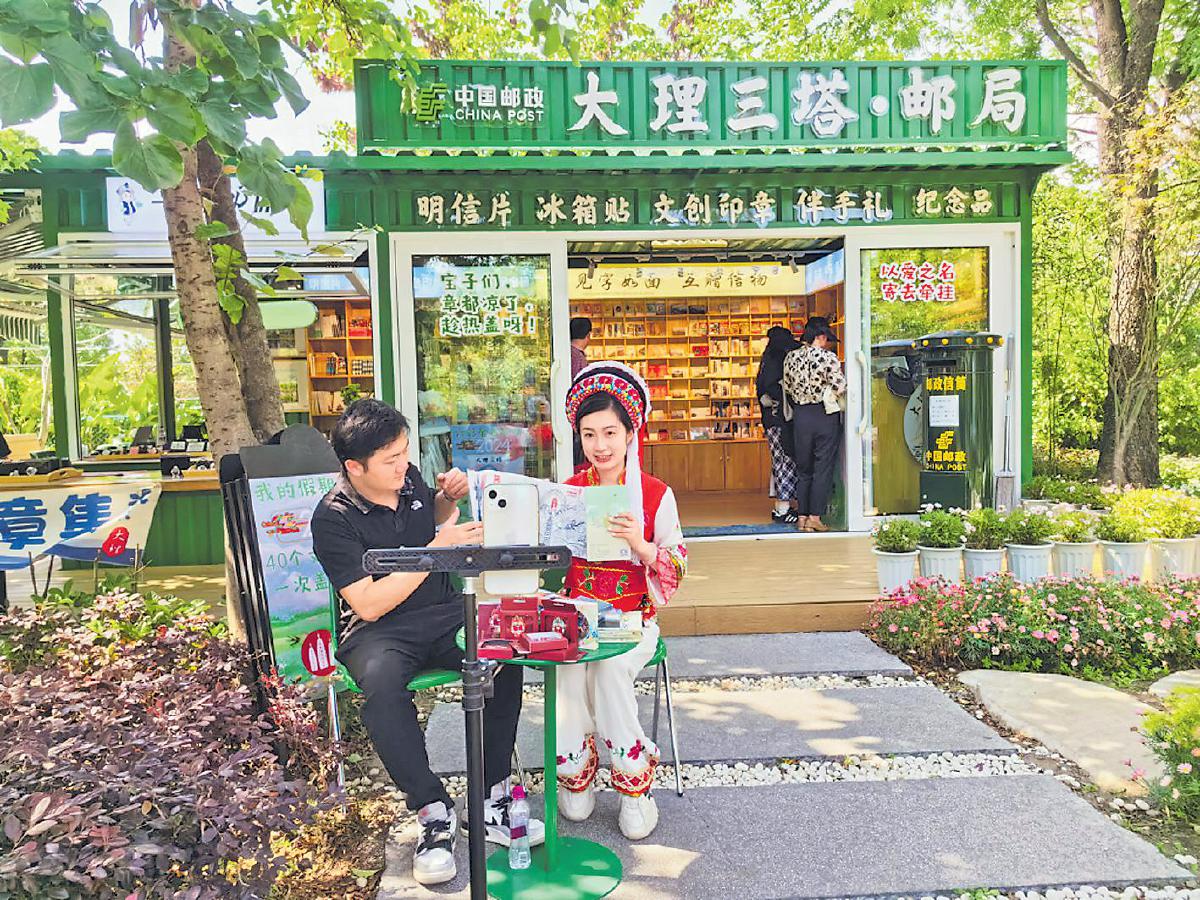 “我在网上刷到三塔主题邮局,所以来这里盖印章。顺着印章顺序打卡游览三塔,是我此次旅途中必须完成的一个项目。”暑假期间,来自安徽的游客王女士期待地说。近两个月来,大理三塔主题邮局迎来旺季人流高峰,平均每天客流量超8000人,主题邮局内的文创产品也受到游客的追捧。