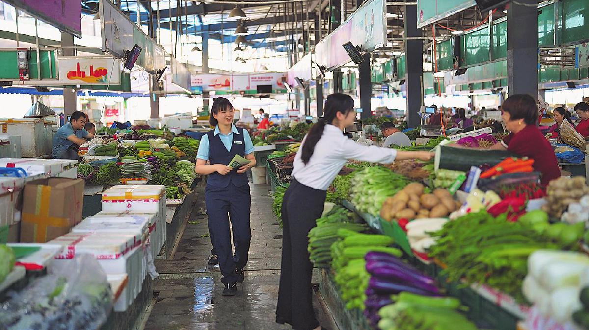 上午9点,阳光透过市场的棚顶,斑驳地洒落在湿漉漉的地面上,空气中弥漫着新鲜蔬菜和水果的香气。在广东省深圳市龙华区观澜综合菜市场,人潮开始涌动,一座城市刚刚醒来。深圳市龙华区邮政分公司的“邮金智联队”成员手持宣传单,向菜摊逐个推介着。