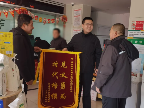 2月17日,山东省滨州市博兴县吕艺邮政支局收到一面印有“见义勇为 时代楷模”的锦旗,在车祸中受伤的张继斌专程赶到吕艺支局,感谢支局经理王万清在其车祸现场见义勇为施援手。张继斌握着王万清的手激动地说:“如果当时没有你在车外拼命呼喊、施以援手,后果真是不堪设想,感谢你救了我!”