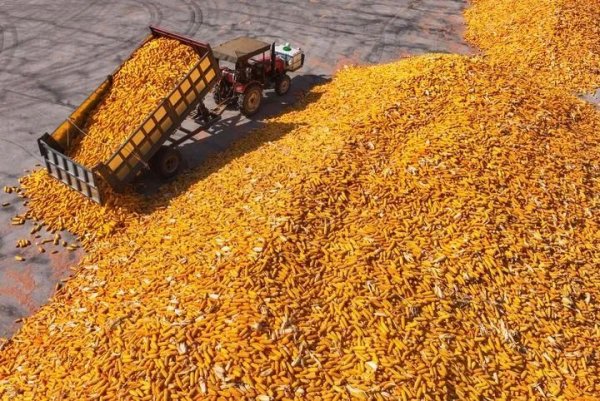 2024年10月12日,在山东省荣成市上庄镇一处粮食烘干中心,村民运送玉米等待烘干(无人机照片)。新华社发(李信君摄)