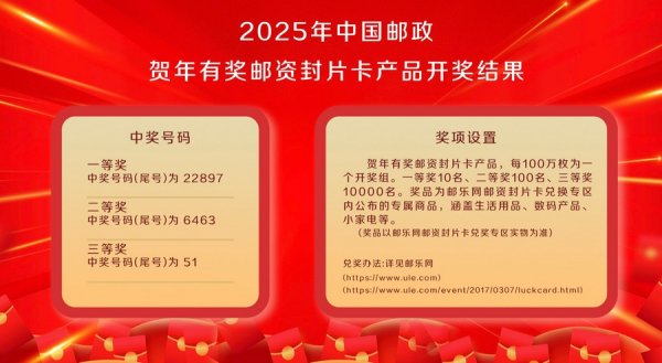 3月24日,2025年中国邮政贺年有奖邮资封片卡产品开奖结果产生。贺年有奖邮资封片卡产品每100万枚为一个开奖组,每个开奖组设3个奖项。奖品为邮乐网邮资封片卡兑换专区内公布的专属商品,涵盖生活用品、数码产品、小家电等,以邮乐网邮资封片卡兑奖专区实物为准。