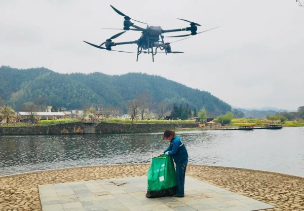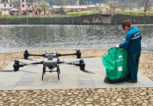 3月30日,在婺源县江湾镇,一架邮政无人机携带重约20公斤装有当日党报党刊、信件及快递包裹的大邮包腾空而起,直飞目的地江湾镇大潋村村委会。10分钟后,无人机徐徐降落在指定位置,圆满完成首次投递,标志着上饶邮政无人机投递在婺源江湾试飞成功。