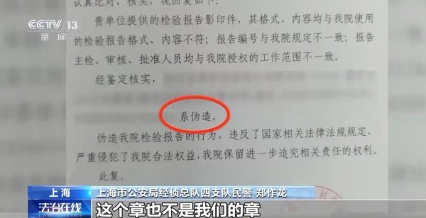 上海市公安局经侦总队四支队民警 郑作龙:因为质检报告上面有盖章,我们直接就到报告的单位,那个单位说从来没有出过这种报告,这个章也不是他们的章。