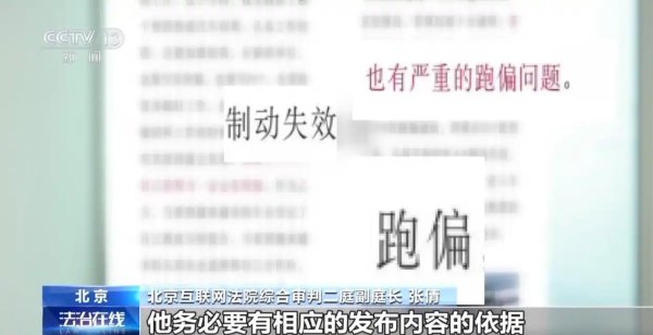 北京互联网法院综合审判二庭副庭长 张倩:这些其实涉及车辆非常核心的安全性问题的一些测评语言,被告又无法提供相应的证据进行支撑。同时原告也向法院提交了被告测评中涉及的车辆的实验室的一些报告和国家检测的报告,我们发现都是合格的,在这样的一个情况下,我们认定被告这样的测评语言是涉及侵犯了原告的名誉权。