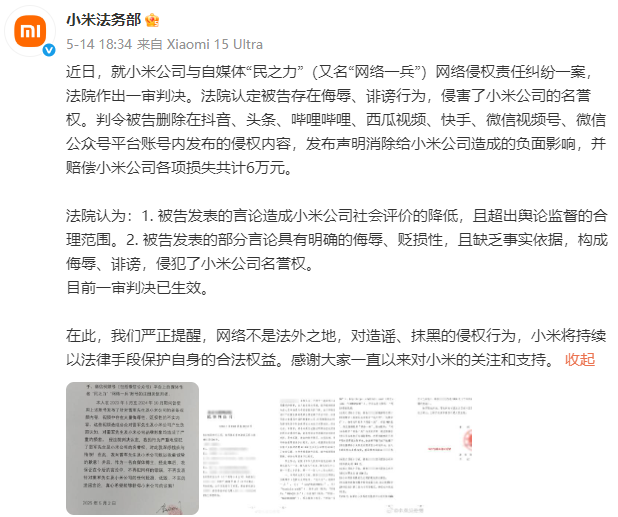 近日,就小米公司与自媒体“民之力”(又名“网络一兵”)网络侵权责任纠纷一案,法院作出一审判决。法院认定被告存在侮辱、诽谤行为,侵害了小米公司的名誉权。判令被告删除在抖音、头条、哔哩哔哩、西瓜视频、快手、微信视频号、微信公众号平台账号内发布的侵权内容,发布声明消除给小米公司造成的负面影响,并赔偿小米公司各项损失共计6万元。