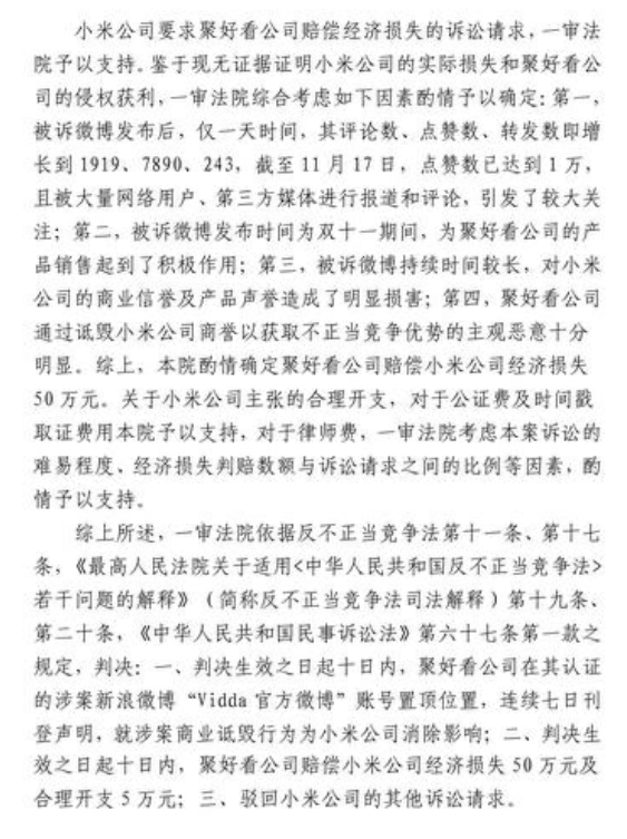 2023年8月31日,法院做出一审判决,法院认为:聚好看公司通过其微博账号“Vidda官方微博”发布侮辱、贬损小米公司的虚假信息和误导性信息,损害了小米公司的商业信誉和商品声誉,构成商业诋毁。法院判令:聚好看公司在“Vidda 官方微博”账号置顶位置,连续七日刊登声明,消除影响,另赔偿小米公司经济损失及合理开支共计55万元。