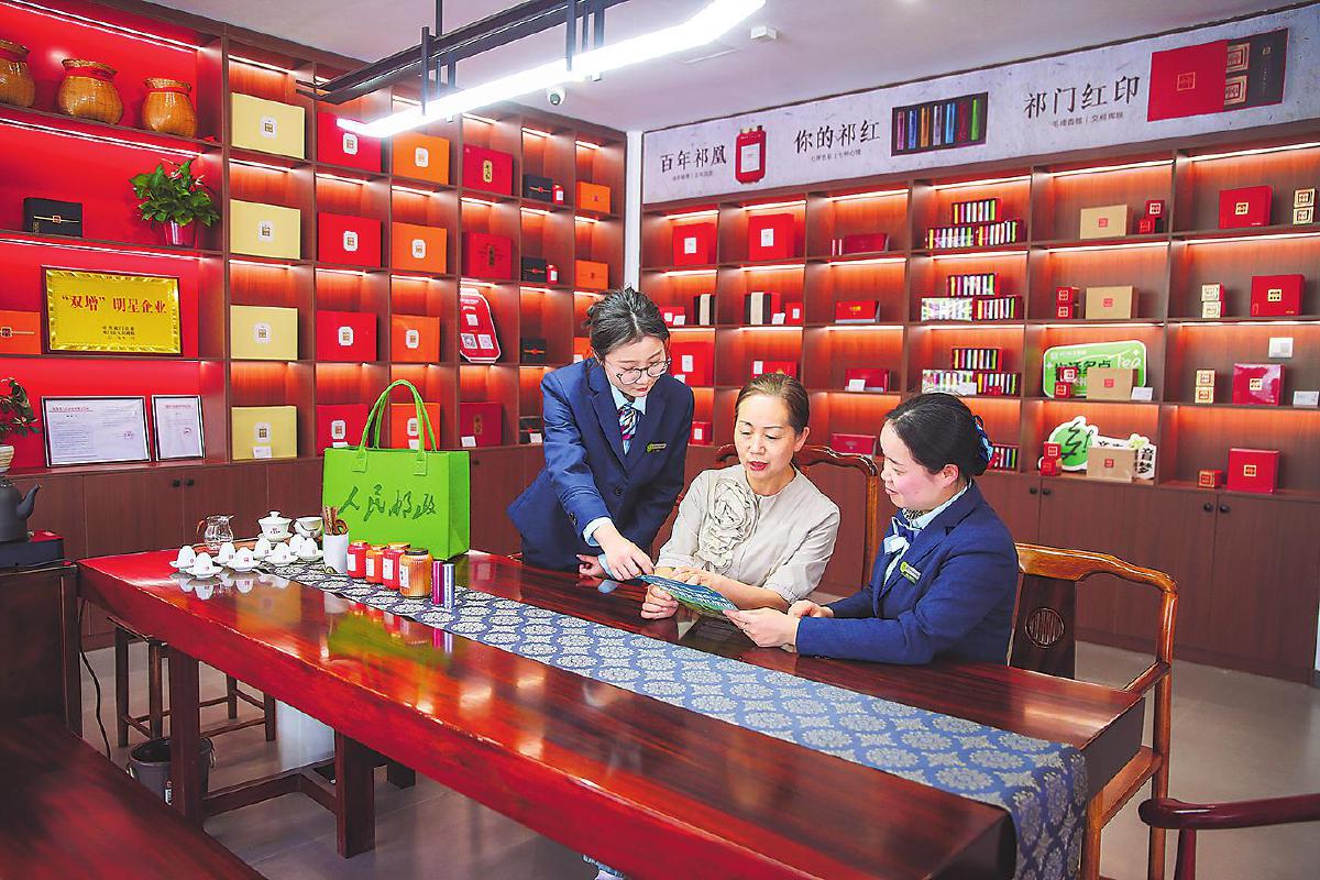 邮政员工向红茶企业负责人推介邮政综合服务。□徐雷 摄