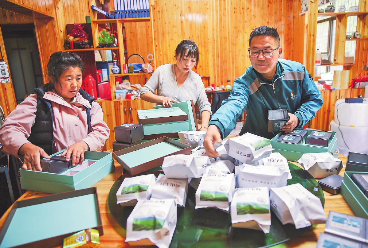 邮政揽投员与茶厂员工一起分装茶叶。□徐雷 摄