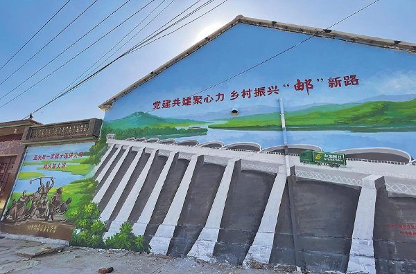 步入宋家王庄村,一幅幅色彩明快、主题鲜明的绘画跃然墙上——党旗猎猎之下,邮政车辆穿梭于绿水青山间,为村民送去邮件与希望;“艰苦奋斗、团结协作”体现淌水崖精神的标语,与当年九山镇人民凿山引水的壮举画面相互呼应,激励着新时代村民接续奋斗。