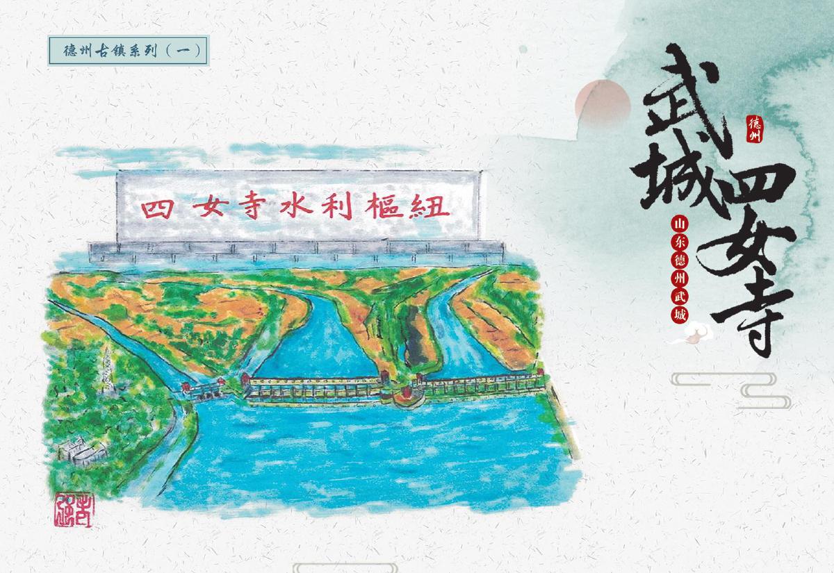 此次首发的文创产品涵盖邮资封、明信片、邮资机宣传戳及主题宣传戳四大类,每一件都浸润着四女寺的文化基因。其中,“四女”邮资封(右上图)以工笔重彩呈现经典场景:画面中四位女子于槐树下漫步,旁侧牌坊古朴,飞鸟点缀天际,还原“四女侍亲,栽槐立誓”的民间传说,四女常伴树侧,行孝事、话桑麻,树与人相衬成景,演绎着传统孝道的温度,让古老美德在时光里熠熠生辉,供后人感怀、传扬;而“四女寺水利枢纽”明信片(右下图)则通过航拍视角与细节特写的结合,展现这座黄河下游重要水利工程的宏伟气势——堤坝蜿蜒如巨龙伏波,闸门启闭间尽显古人治水的智慧结晶,让现代观者得以触摸历史的温度。