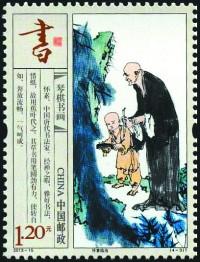2013年7月13日,我国发行了2013-15T《琴棋书画》特种邮票一套4枚。第三枚“怀素临池”, 画面左侧为“書”和印章及“怀素,中国唐代书法家(图④)。经禅之暇,雅好书法,惜纸,故用蕉叶代之。其草书用笔圆劲有力,使转自如,奔放流畅,一气呵成”文字;右侧描绘了怀素与手捧砚台的书童在芭蕉树前练字时的情景。