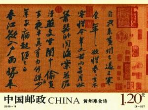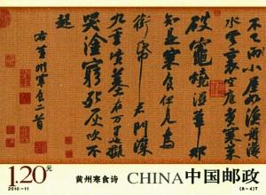 2010年5月15日,我国发行了2010-11T《中国古代书法-行书》特种邮票一套6枚,其中第三、四枚为“黄州寒食诗(局部)”(图⑥、图⑦)。