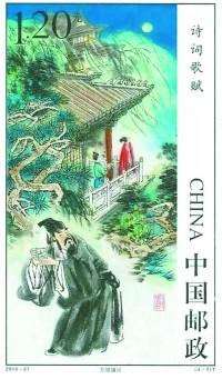 2015年11月12日,我国发行了2015-27T《诗词歌赋》特种邮票,全套4枚。第二枚“东坡填词”(图⑧),邮票前景为词人苏轼举杯填词的动态,他眼睛微闭,似乎是在思念故人,背景为其代表作《水调歌头》。画面中词人手执酒杯,与背景中望月遥寄思念的人物形成互动,更衬托出思念和不舍之情。