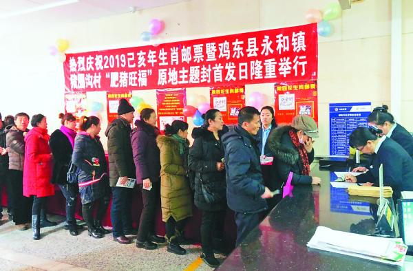 鸡东县永和镇猪圈沟村被命名为全国生肖原地邮局之一。1月5日8时30分,鸡东县分公司营业大厅正式发行销售特种邮票。鸡东县分公司集邮与文化传媒部将销售现场布置得非常喜庆,通过悬挂条幅、粘贴海报等气氛渲染,让人感受猪年的到来,销售现场异常火暴(图⑧)。广大集邮爱好者纷纷排队购买“肥猪旺福”、“五福齐聚”生肖邮票与小本票,并现场加盖原地封纪念戳。