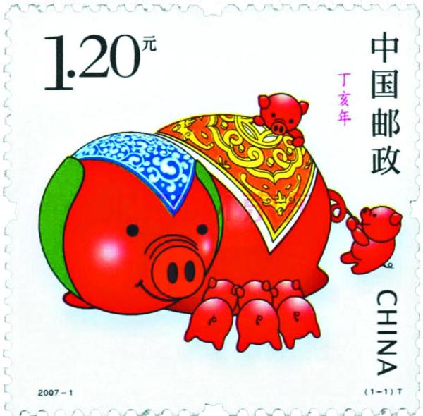 第三轮生肖猪票发行于2007年1月5日,题名《丁亥年》,志号2007-1,一套1枚,面值1.20元。邮票图案由一头披着头巾和披肩的猪妈妈和5只小猪构成。猪妈妈憨态可掬,用慈祥的目光自豪地看着争相吸吮母乳的3只猪宝宝;另外两只猪宝宝分别位于猪妈妈的尾部和背上,嬉戏玩耍,灵动可爱,其图案用彩艳丽,十分喜庆(图③)。