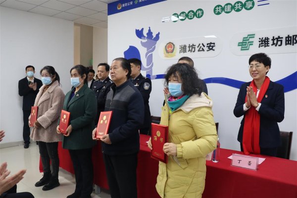 12月24日上午,“警邮共建反诈主题邮局”揭牌仪式在潍坊城里邮政支局举行,标志着全省第一家“警邮反诈主题邮局”正式成立。潍坊市邮政分公司及市公安局相关领导参加揭牌仪式并致辞,来自潍城区各社区、艺术协会的代表30余人参加了此次揭牌仪式。揭牌仪式上,警邮双方代表还为义务宣讲员颁发聘书。